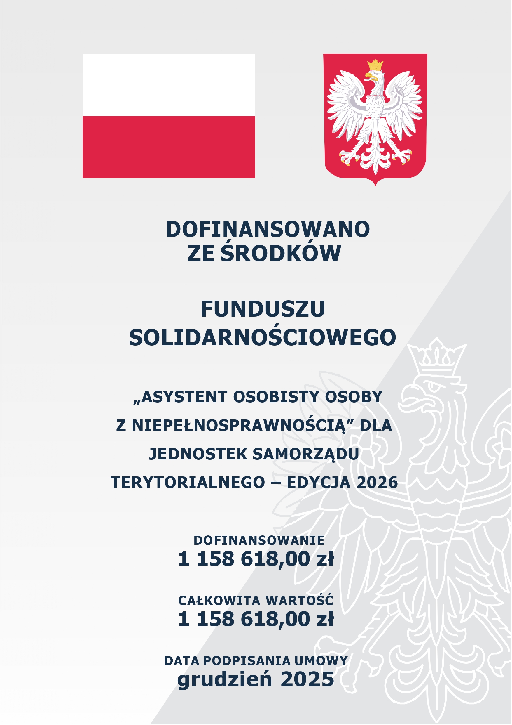 Program resortowy Ministra Rodziny i Polityki Społecznej „Asystent osobisty osoby z niepełnosprawnością” dla Jednostek Samorządu Terytorialnego - edycja 2026 finansowany jest ze środków Funduszu Solidarnościowego.